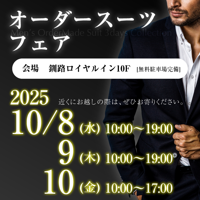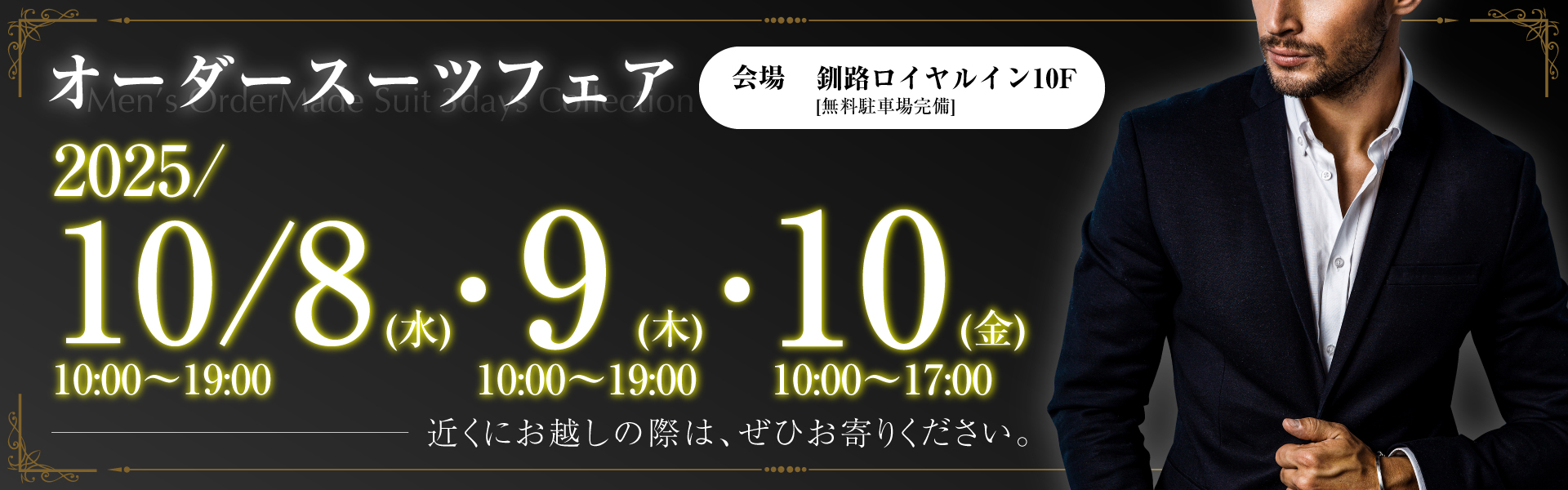 釧路市内で年2回オーダースーツフェアを行っております。お近くにお越しの際は、ぜひお寄りください。